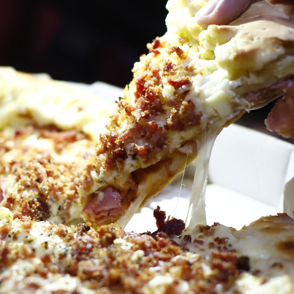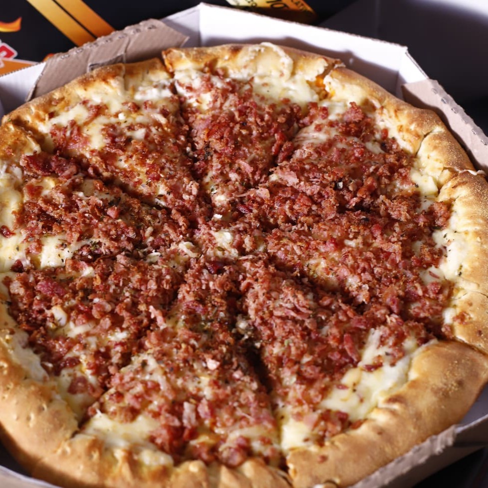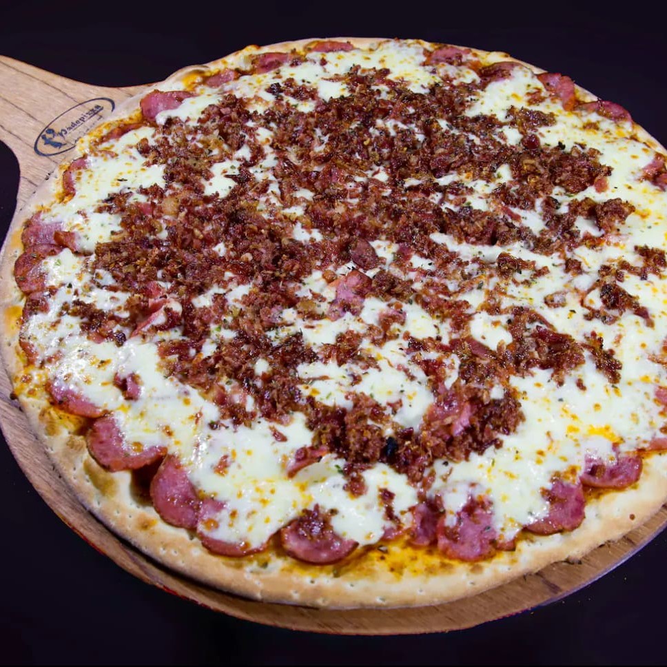 Nossa Pizza Carro Chefe, De Dois Andares, Com 27cm, 8 Fatias, Um Quilo De Recheio. No Primeiro Andar É Molho, Mussarela, Requeijão E Frango: No Segundo Andar É Provolone, Parmesão, Bacon E Molho Especial, Sem Contar Com A Borda Que Vem Recheadíssima Com Cheddar, Requeijão E Mussarela. Com aproximadamente 1kg de recheio!