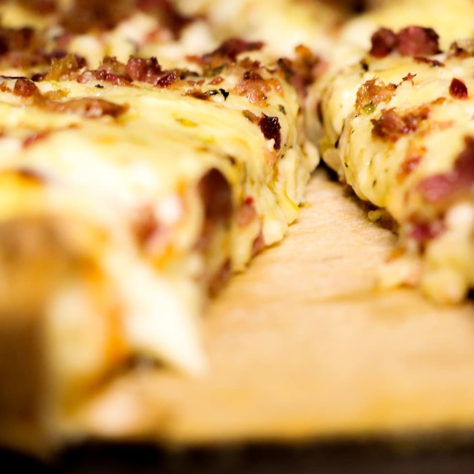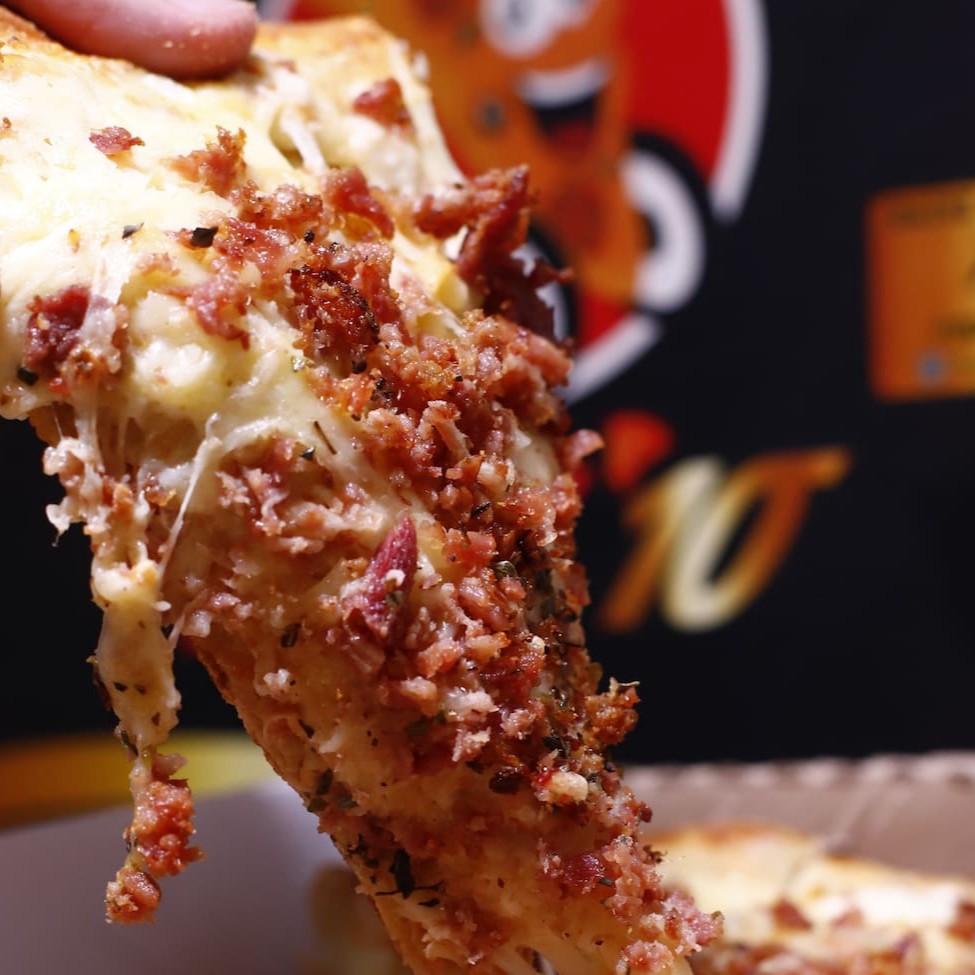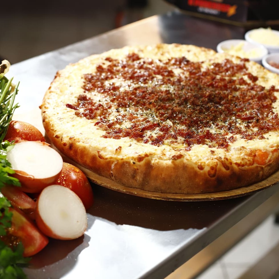Nossa Pizza Carro Chefe, De Dois Andares, Com 27cm, 8 Fatias, Um Quilo De Recheio. No Primeiro Andar É Molho, Mussarela E Atum: No Segundo Andar É Provolone, Parmesão, Bacon E Molho Especial, Sem Contar Com A Borda Que Vem Recheadíssima Com Cheddar, Requeijão E Mussarela. Com aproximadamente 1kg de recheio!