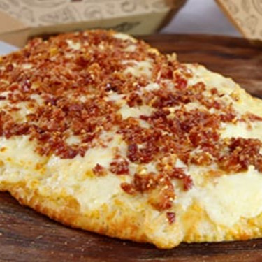 Calzone Poderosa com um recheio maravilhoso de mussarela, parmesão e requeijão; por cima vai nosso molho especial, parmesão, provolone e bacon. (28 cm, 7 fatias).
