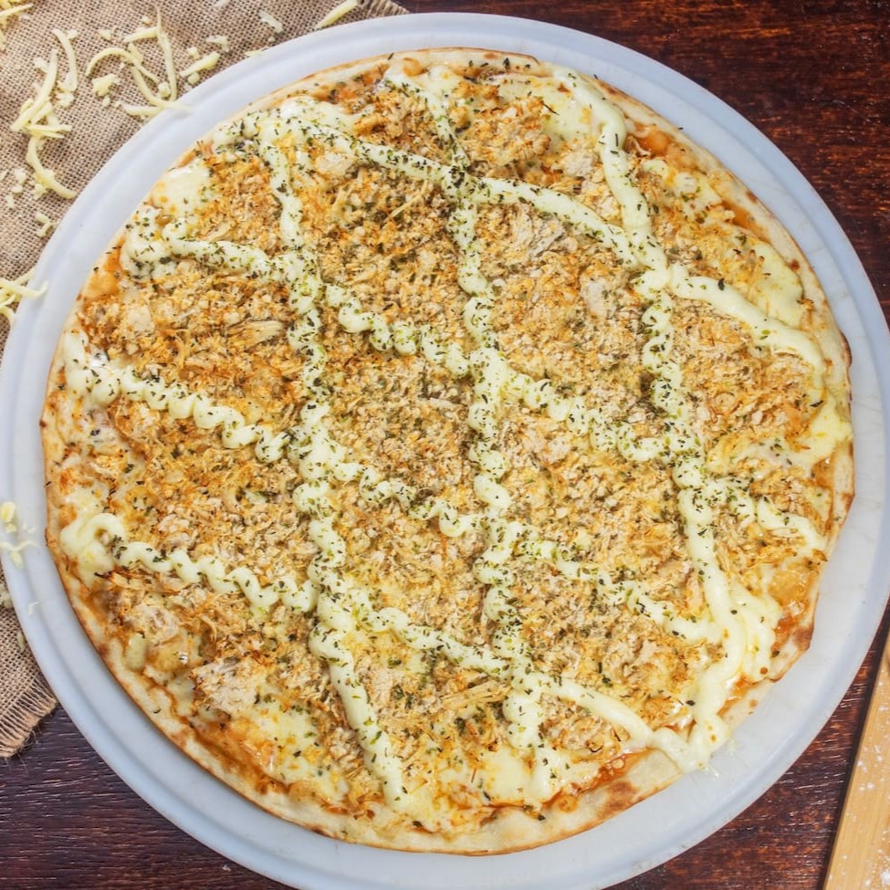 Deliciosa pizza de (30cm), massa fina, base com molho artesanal, frango desfiado, catupiry cremoso, mussarela, e finalizada com orégano.