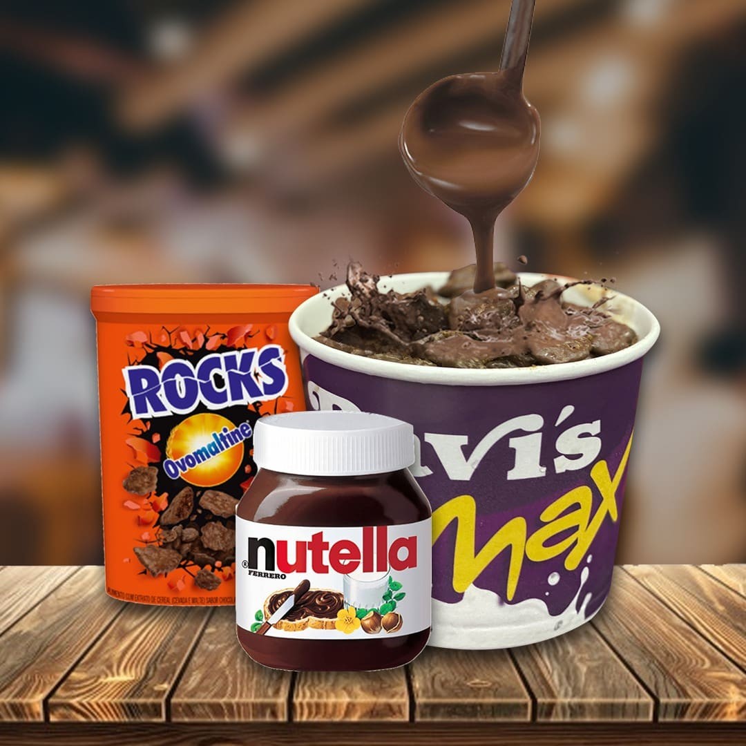 Maravilhoso Sorvete de Baunilha + Calda de Nutella + Ovomaltine Triturado Crocante + Rocks Flocão Crocante de Ovomaltine (Coberto por um cremoso Chocolate ao Leite.