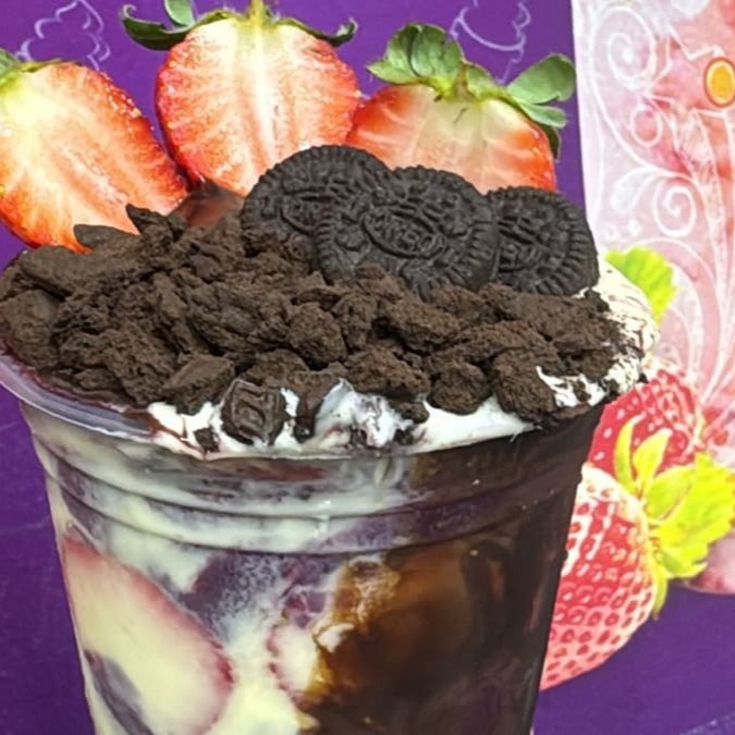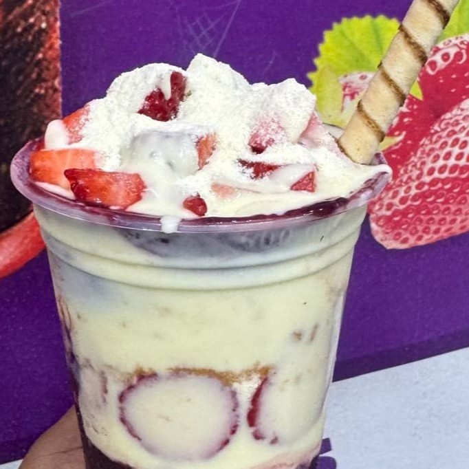 Creme de Ninho, Chocolate meio amargo, Leite em pó, Fruta (2 camadas Fruta) + Canudinho.