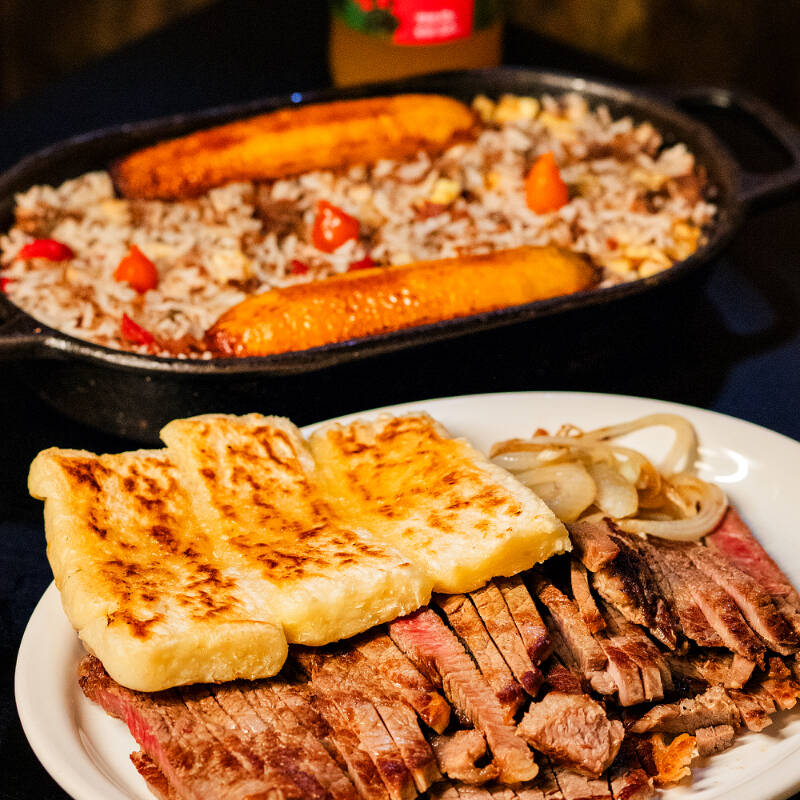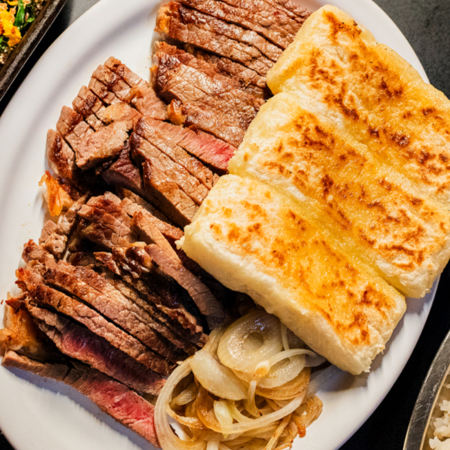 alcatra de sol, aipim ou batata e cebola