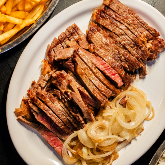 contra-filé de sol, aipim ou batata frita e cebola
