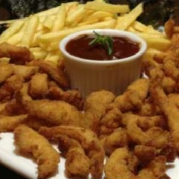 Um delicioso peixe cortado em isca e empanado . Acompanha molho tártaro.