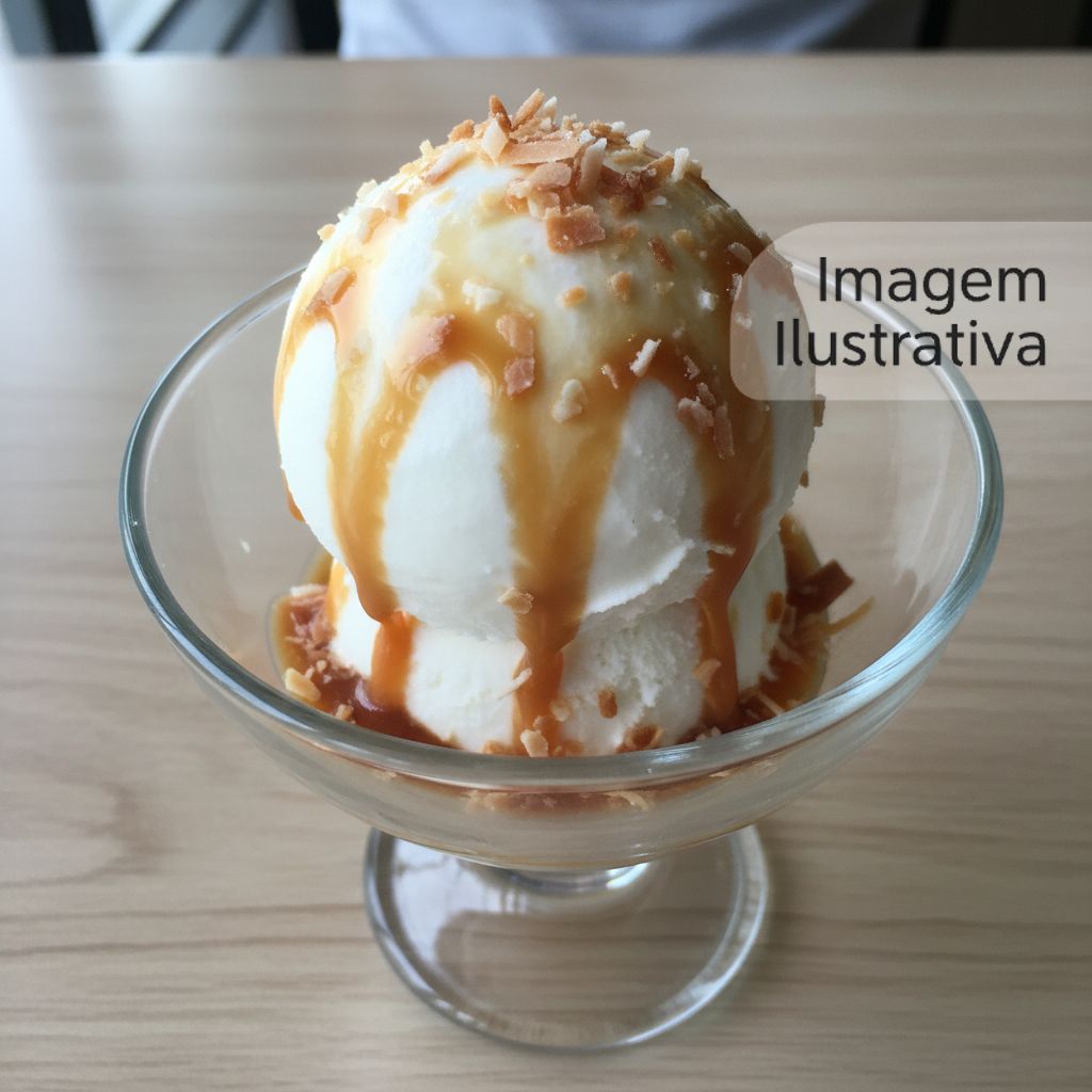 Sorvete refrescante de coco combinado com uma deliciosa calda de caramelo.