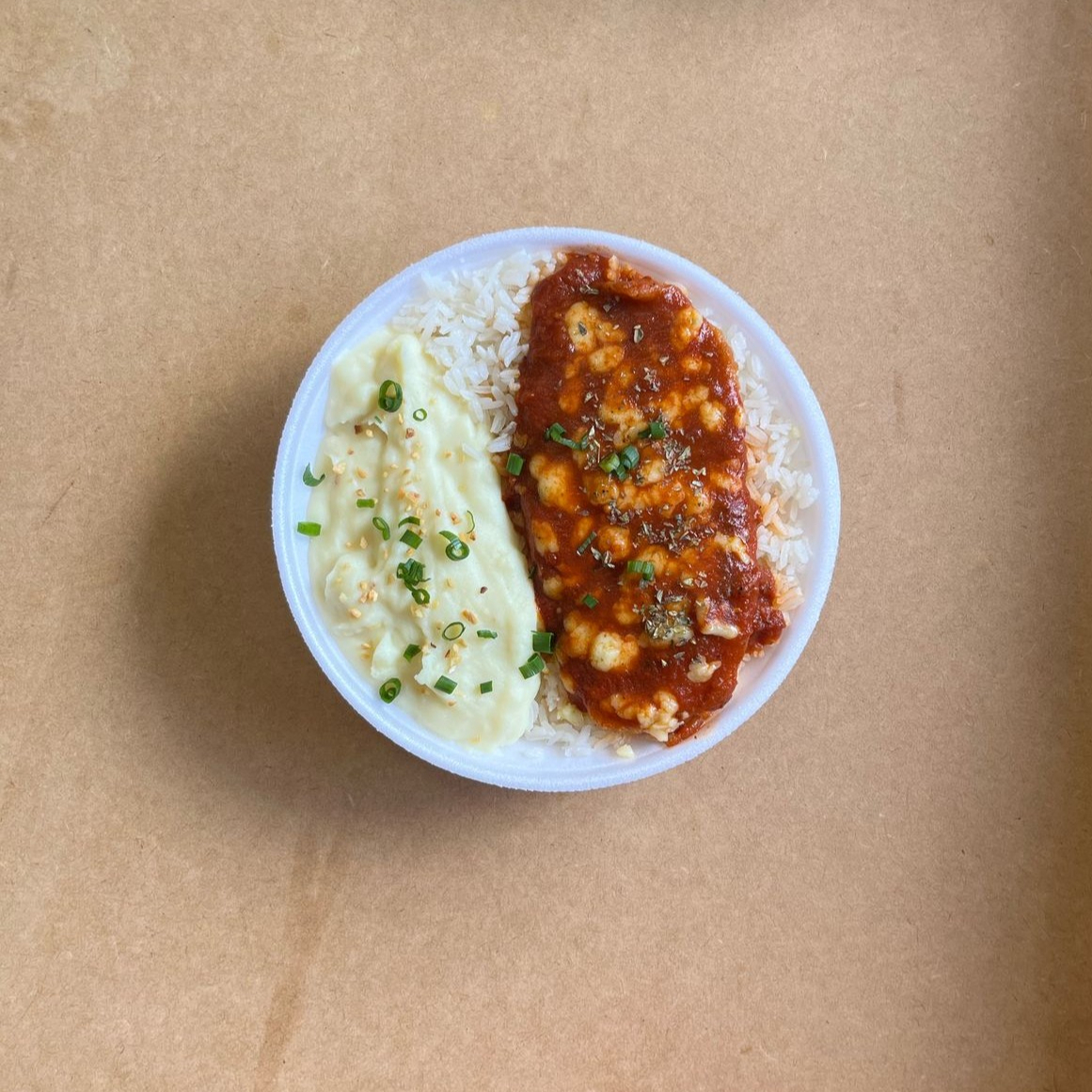 Marmita com delicioso filé de frango parmegiana (empanado na massa crocante coberto com molho de tomates e queijo) acompanhado de arroz branco e purê de batatas inglesas. Marmita indicada para 01 pessoa.