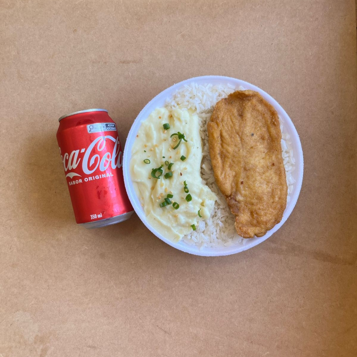 Marmita com delicioso filé de frango empanado na massa crocante acompanhado de arroz branco, feijão e purê de batatas inglesas Acompanha refrigerante lata Coca Cola 350ml bem gelada. Marmita indicada para 01 pessoa.
