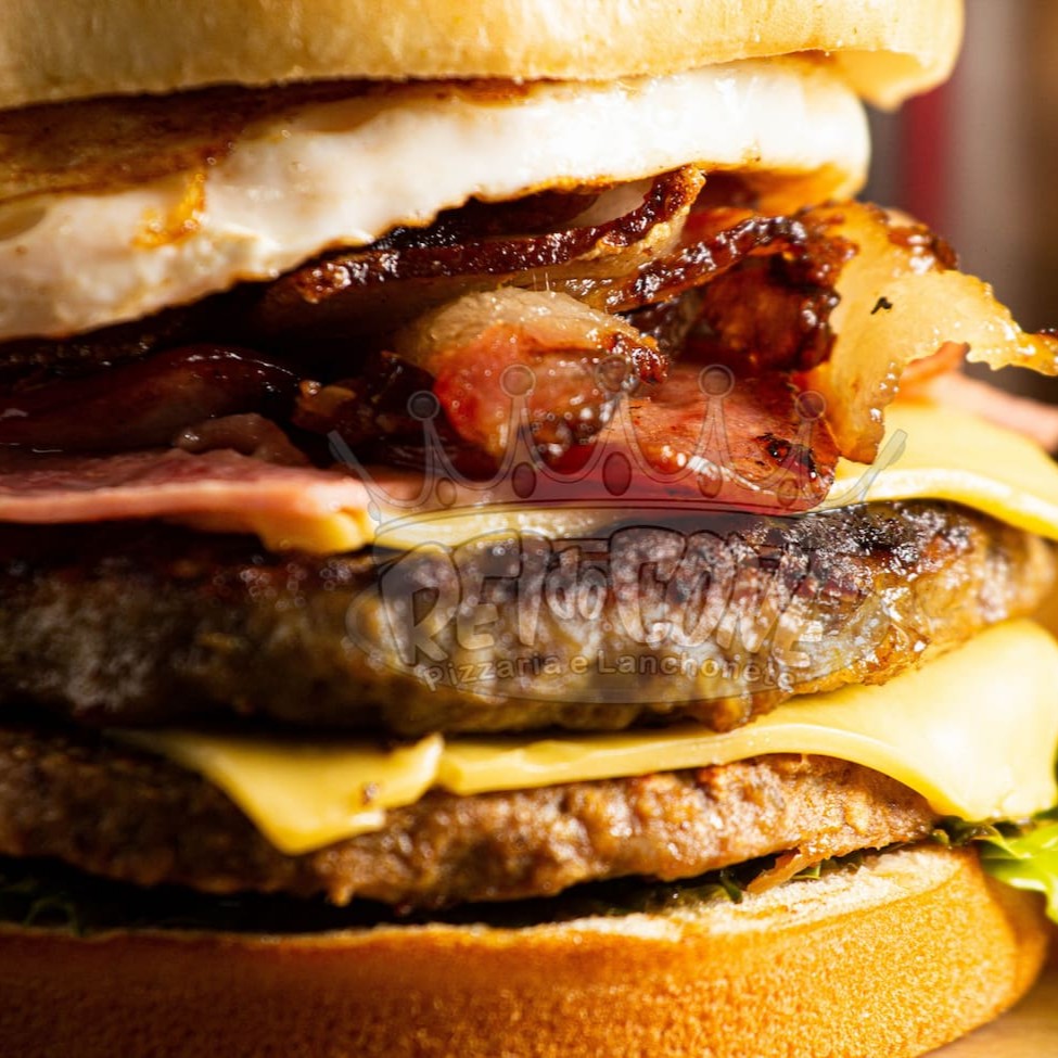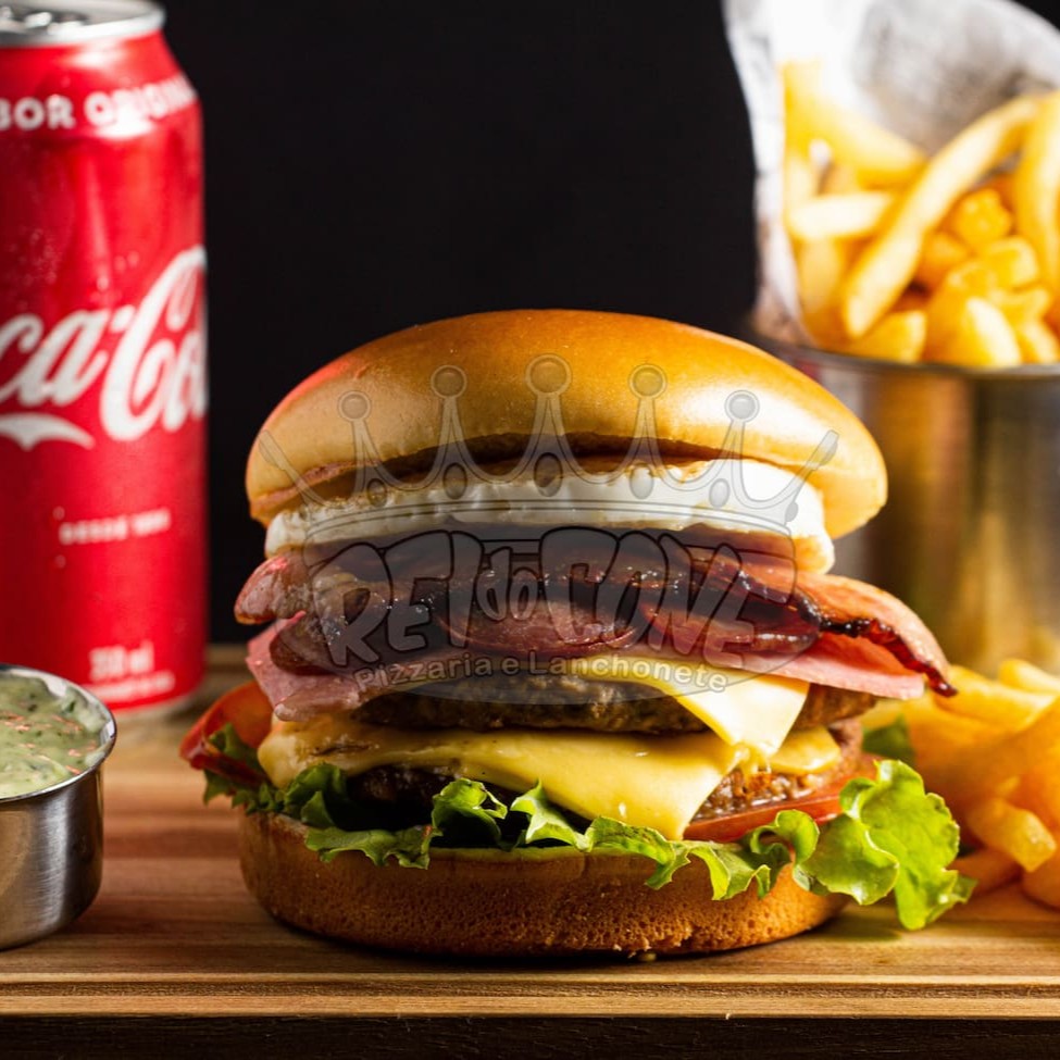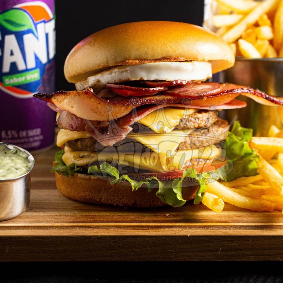 Pão de brioche, 2 hambúrguer de picanha, queijo chedar fatiado, presunto, bacon, Catupiry, ovo, salada e molho especial.