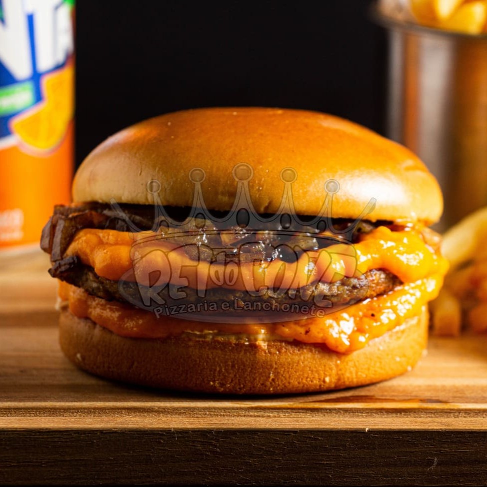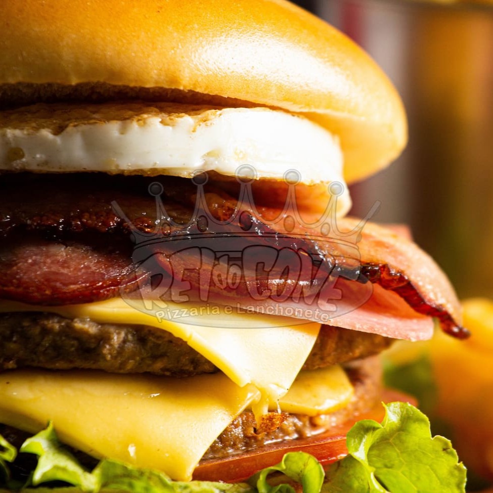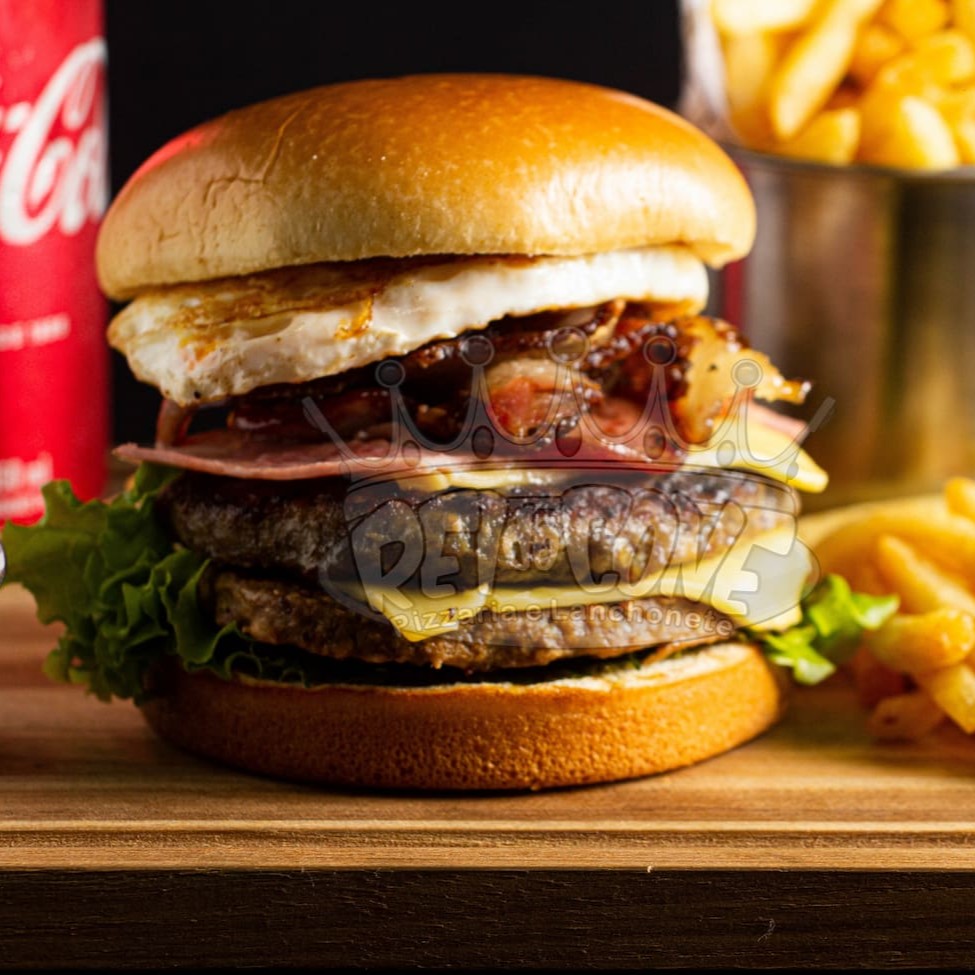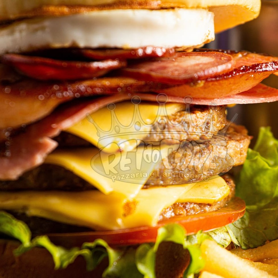 Pão de brioche, 2 hambúrguer de picanha, queijo chedar fatiado, presunto, bacon, Catupiry, ovo, salada e molho especial.