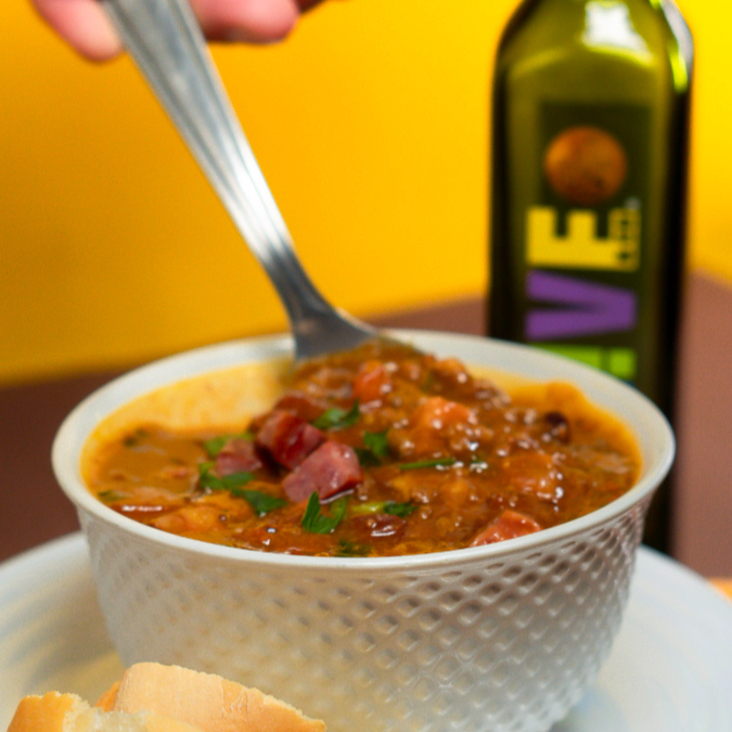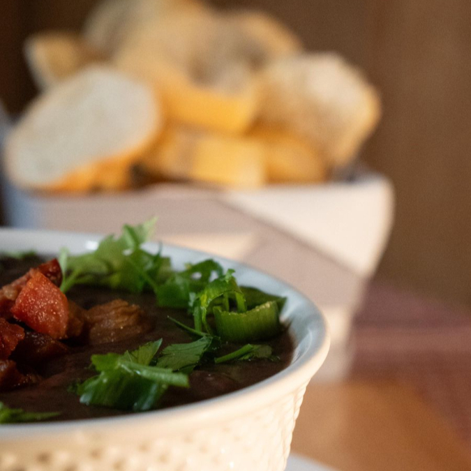 Feijão vermelho com carne moída, calabresa e bacon, levemente apimentado com a pimenta da casa. Acompanha torrada crocante!