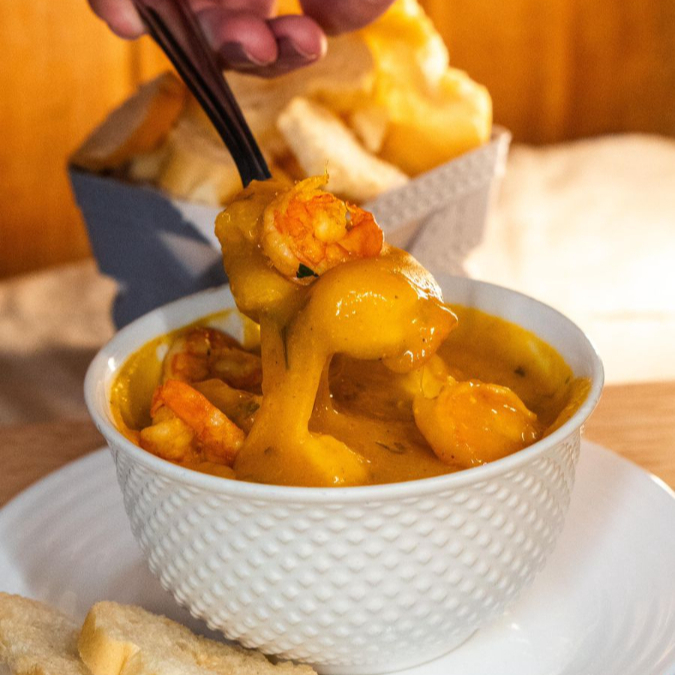 Caldo cremoso de aipim preparado com leite de coco e tempero especial da casa, finalizado com uma generosa porção de camarões. Acompanha torradas crocantes.