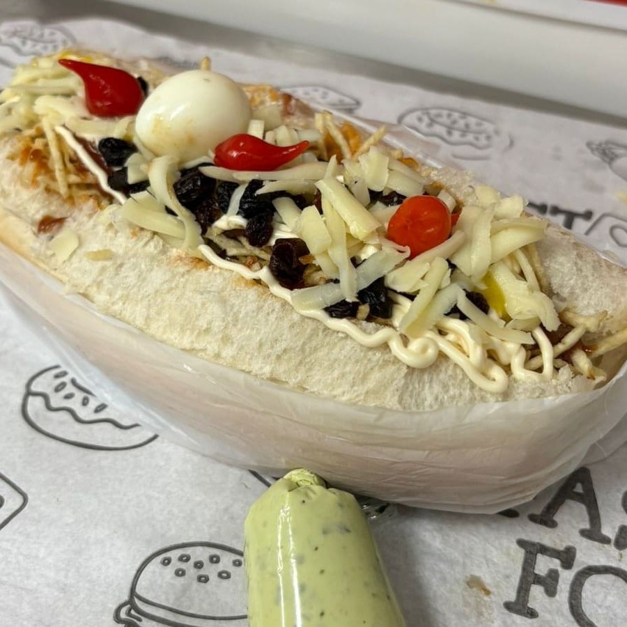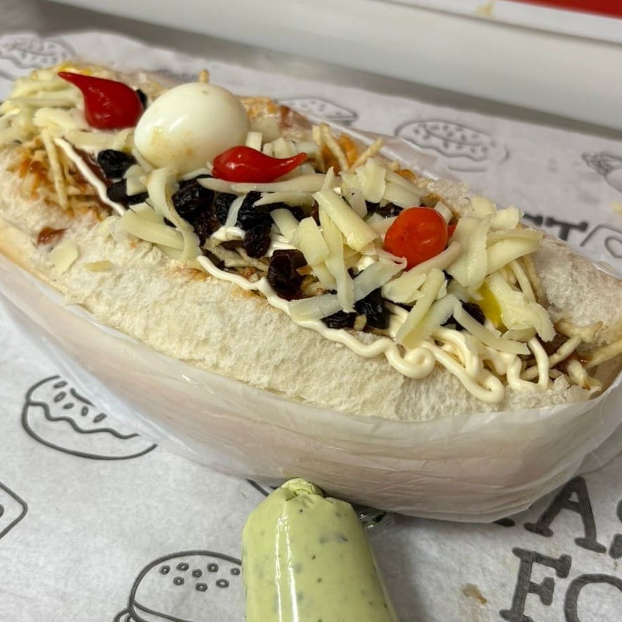 Pão, salsicha, molho cru (pimentão, cebola e tomate), batata palha, ovo de codorna, queijo ralado, passas, katchup, mostarda, maionese e pimenta biquinho