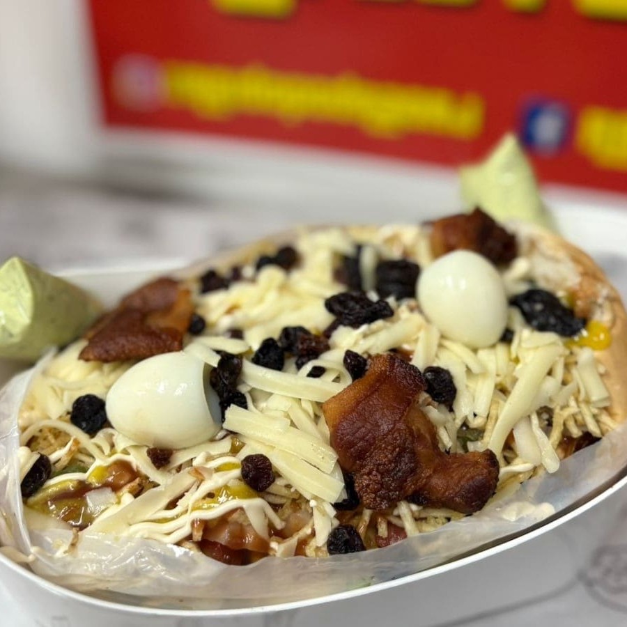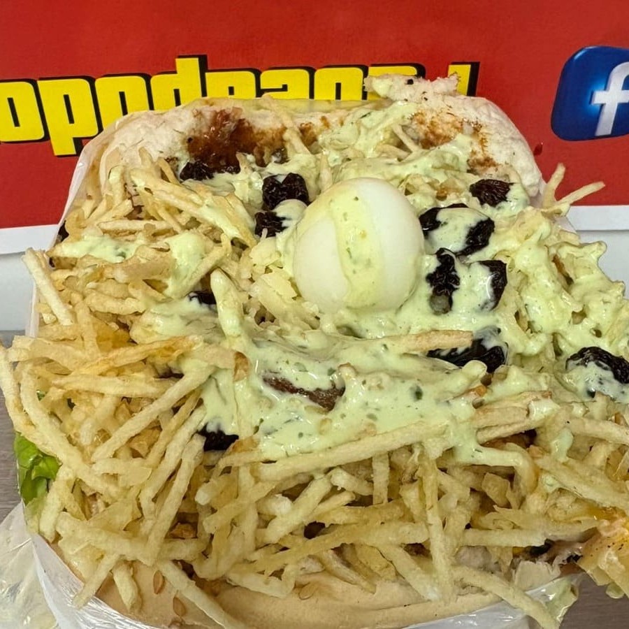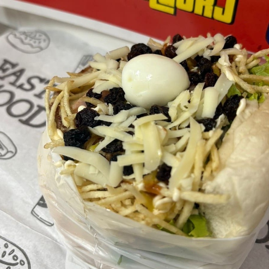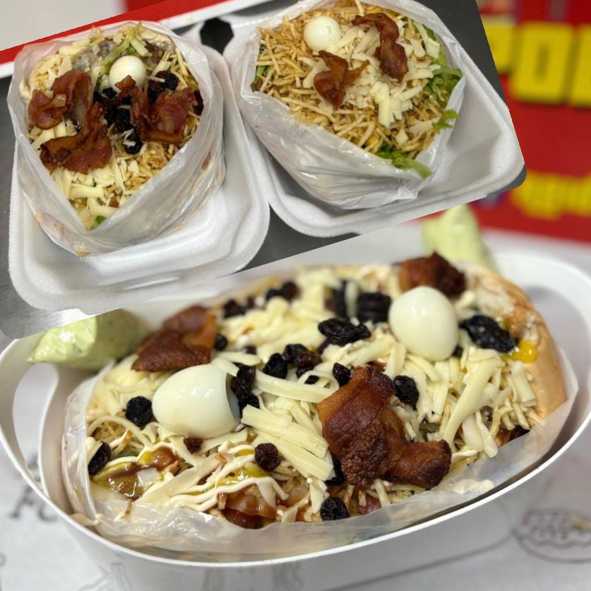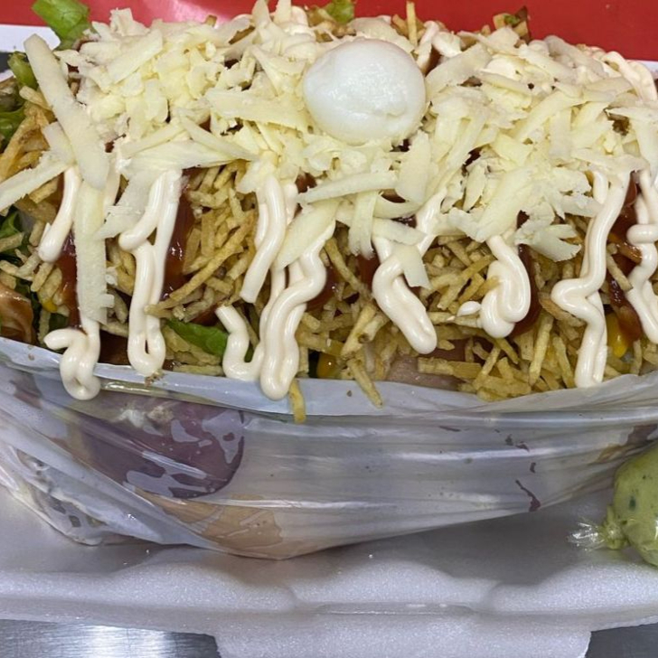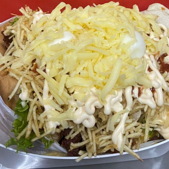 4 Pão, 6 carne, bacon, calabresa, 2 ovos, queijo, presunto, alface, molho cru (pimentão, cebola e tomate), milho, batata palha, ovo de codorna, passas, katchup, mostarda e maionese