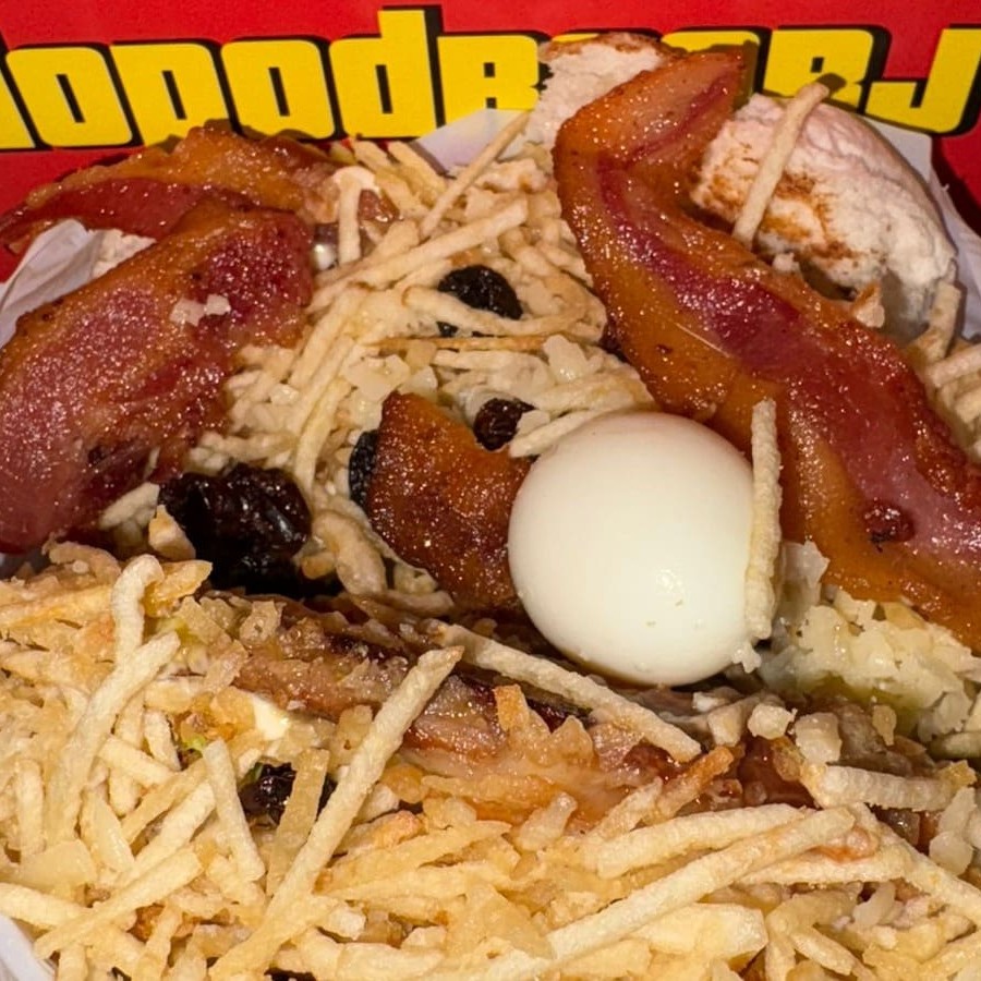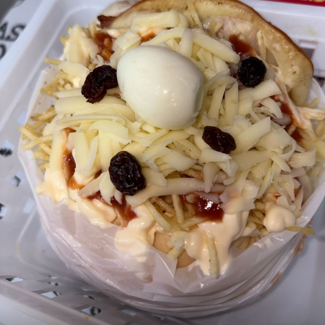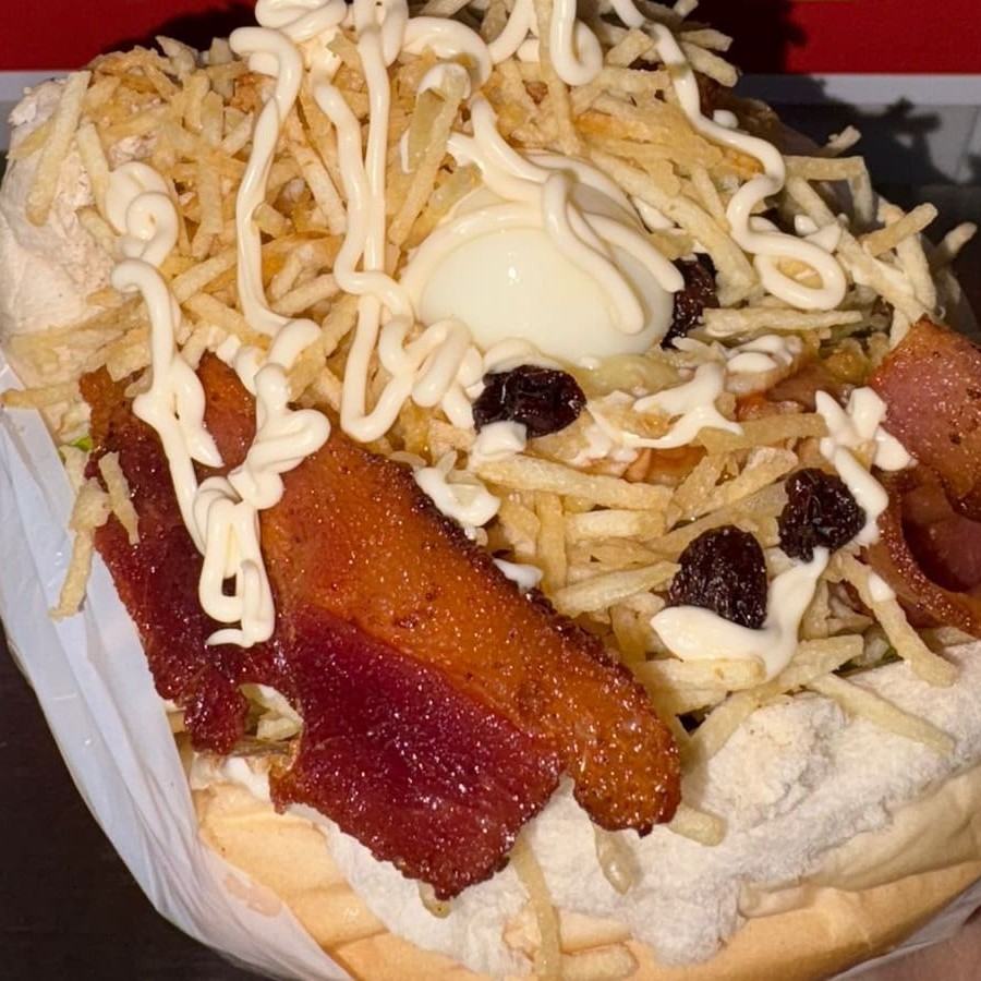Pão ,carne,presunto,ovo,Provolone,bacon ,ketchup,maionese Hellmans ,mostarde ,cebola roxa,tomate,,batata palha mussarella ralada e passas