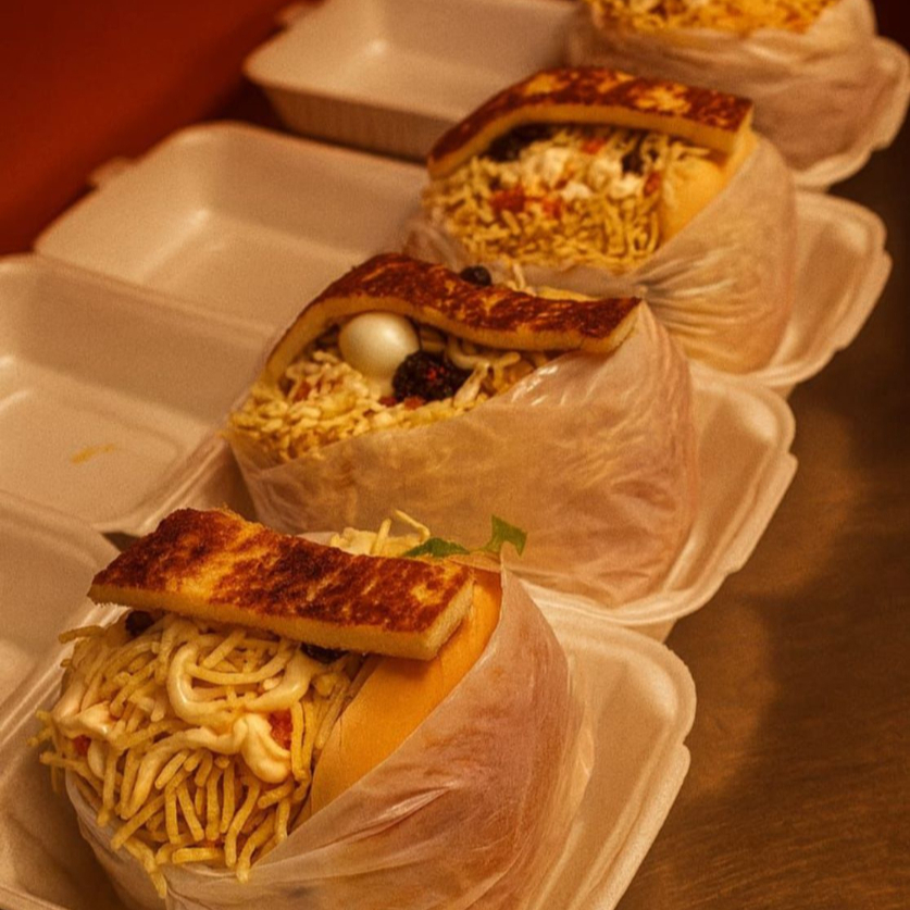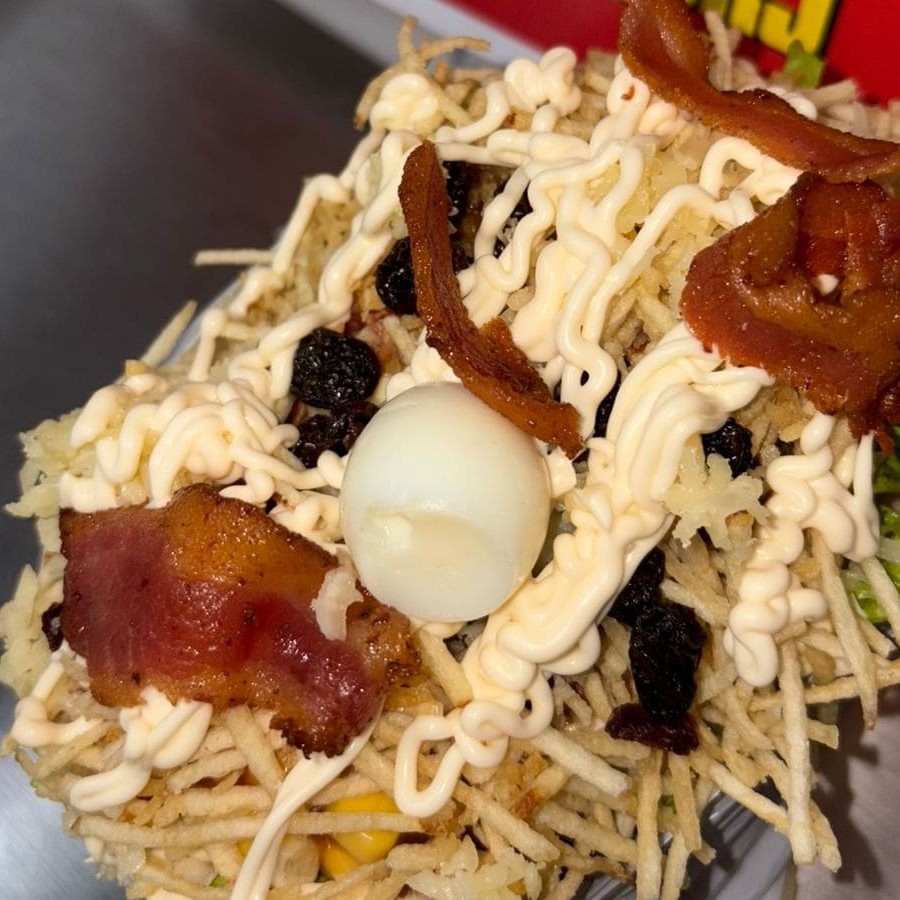 3 Pão, 3 carne, bacon, ovo, calabresa, queijo, presunto, alface, molho cru (pimentão, cebola e tomate), milho, batata palha, ovo de codorna, passas, katchup, mostarda e maionese