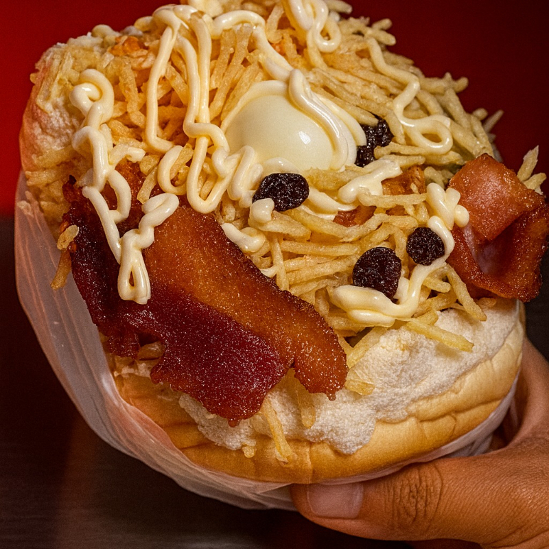 Pão, carne, 1 Polenguinho, ovo, bacon, queijo, presunto, alface, molho cru (pimentão, cebola e tomate), milho, batata palha, ovo de codorna, passas, katchup, mostarda e maionese
