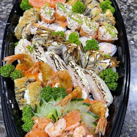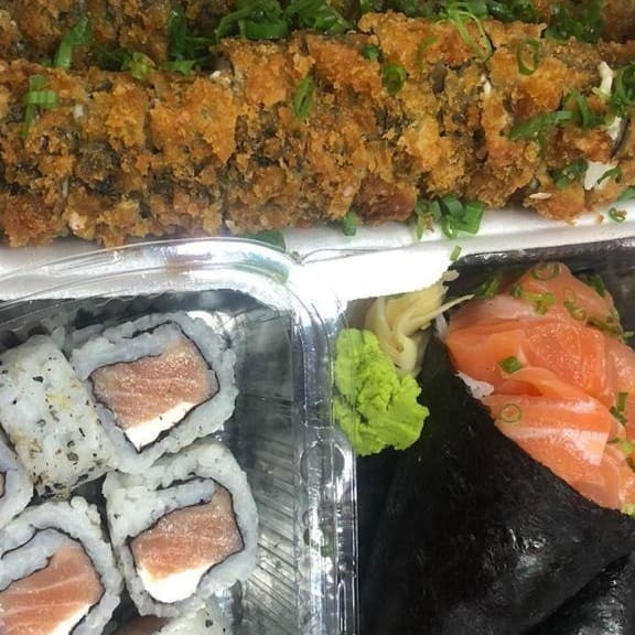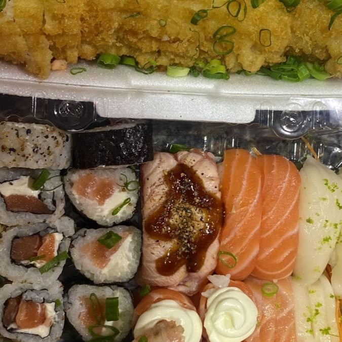 5 sashimi salmão, 5 pirulito de salmão, 5 ura especial, 5 fila especial, 5 sushi haddock, 5 joe ebi, 1 temaki fila, 5 sushi camarão, e 5 hot especial da casa.