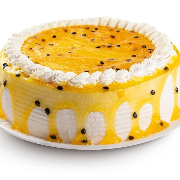 Bolo branco recheado com mousse de maracujá, coberta de chantilly e decorado com calda de maracujá.