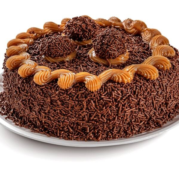 Bolo de chocolate recheado com brigadeiro e doce de leite, coberto com chocolate e granulado.