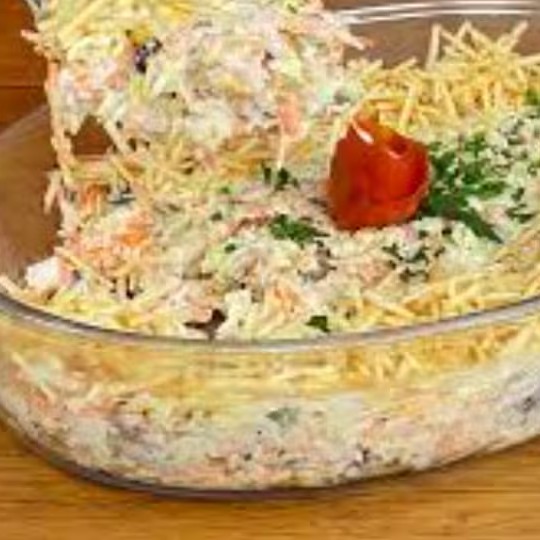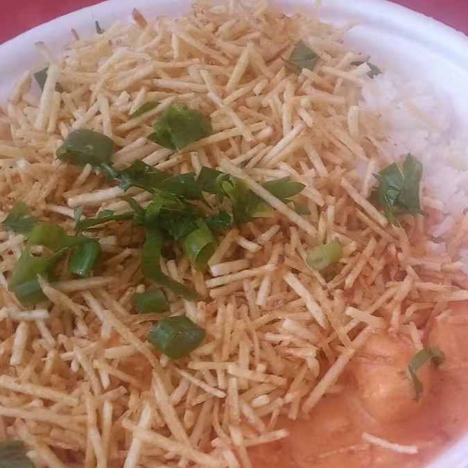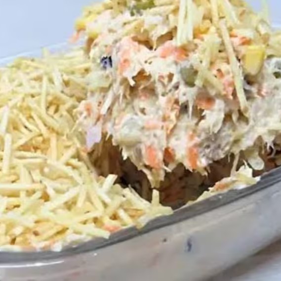 Batata palha, passas , frango desfiado , maionese, cheiro verde e cenoura ralada