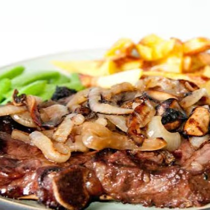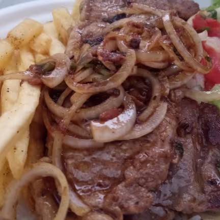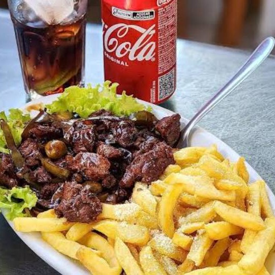 3 bife de alcatra acebolado c batata frita+ coca lata