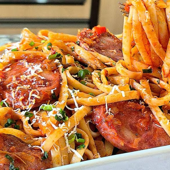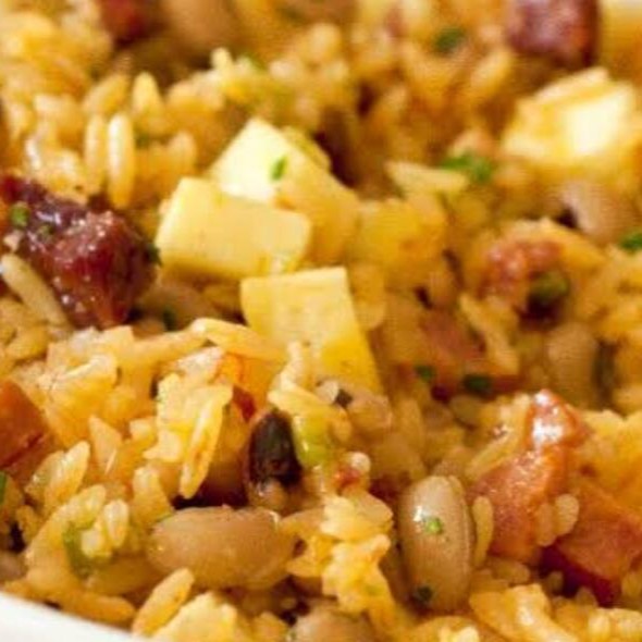 Arroz, feijão fradinho, cheiro verde, calabresa picada, queijo,