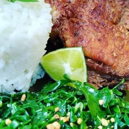 Arroz, feijão, farofa, aimpi frito e carne de porco assado na panela