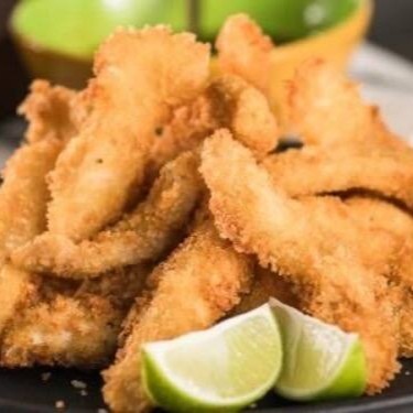 Isca de frango á milanesa, serve até 2 duas pessoas. Isca de frango c/ arroz, feijão e fritas