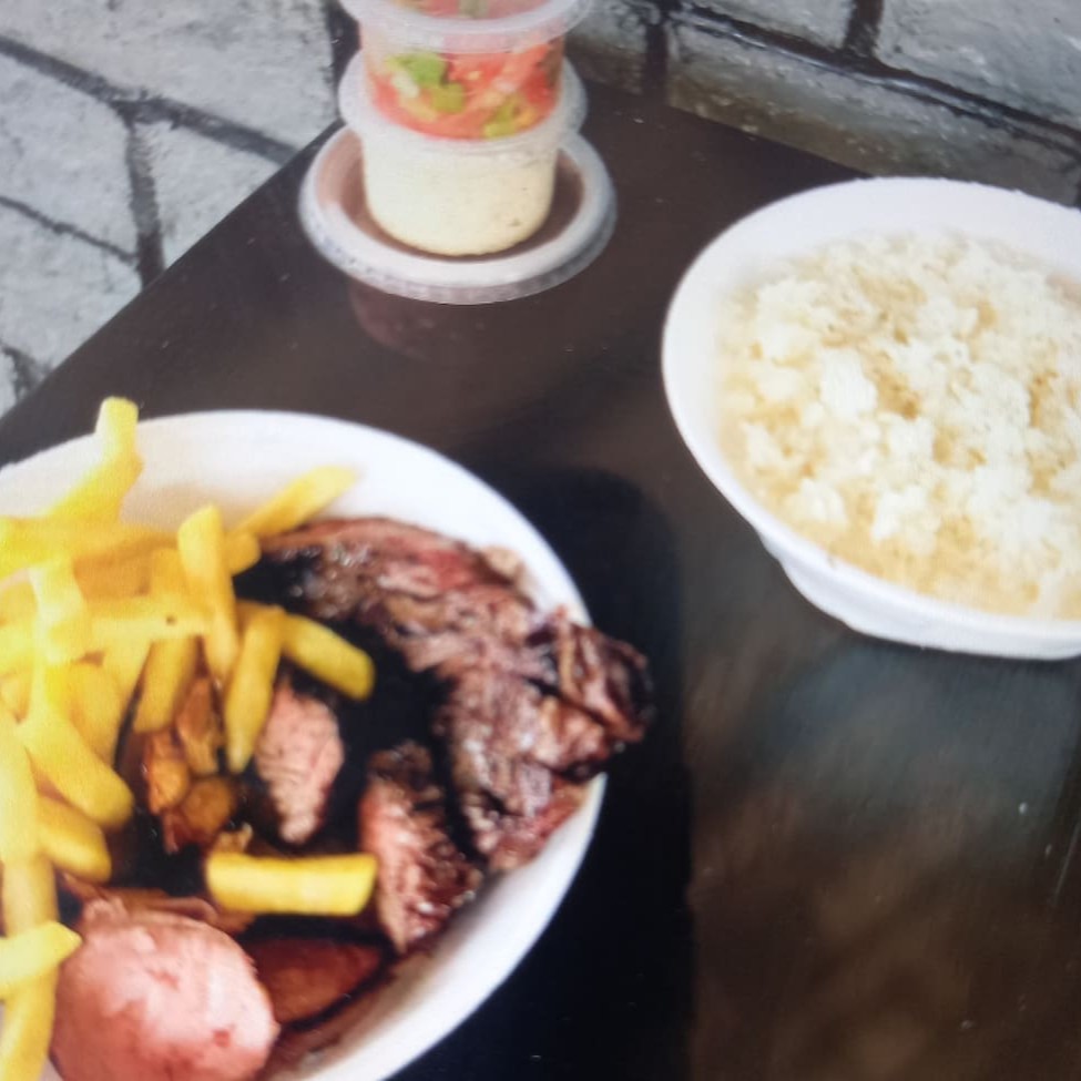 Contra-filé, drumet, linguiça suína, linguiça de frango. Acompanha: arroz, feijão, farofa, molho e fritas.