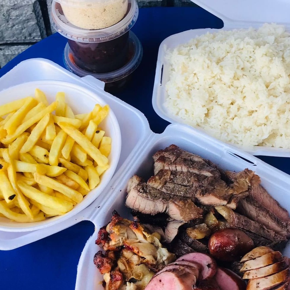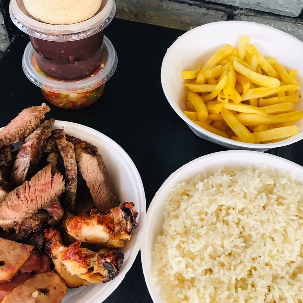 Contra-filé, drumet, linguiça suína e linguiça de frango. Acompanha: arroz, feijão, farofa, molho e fritas.