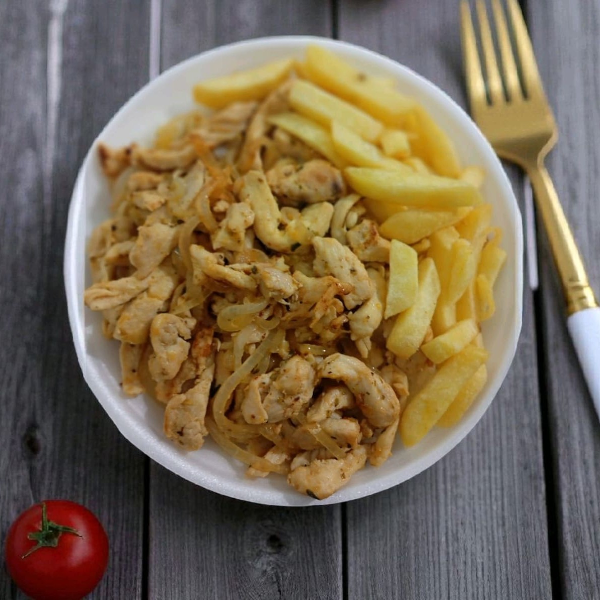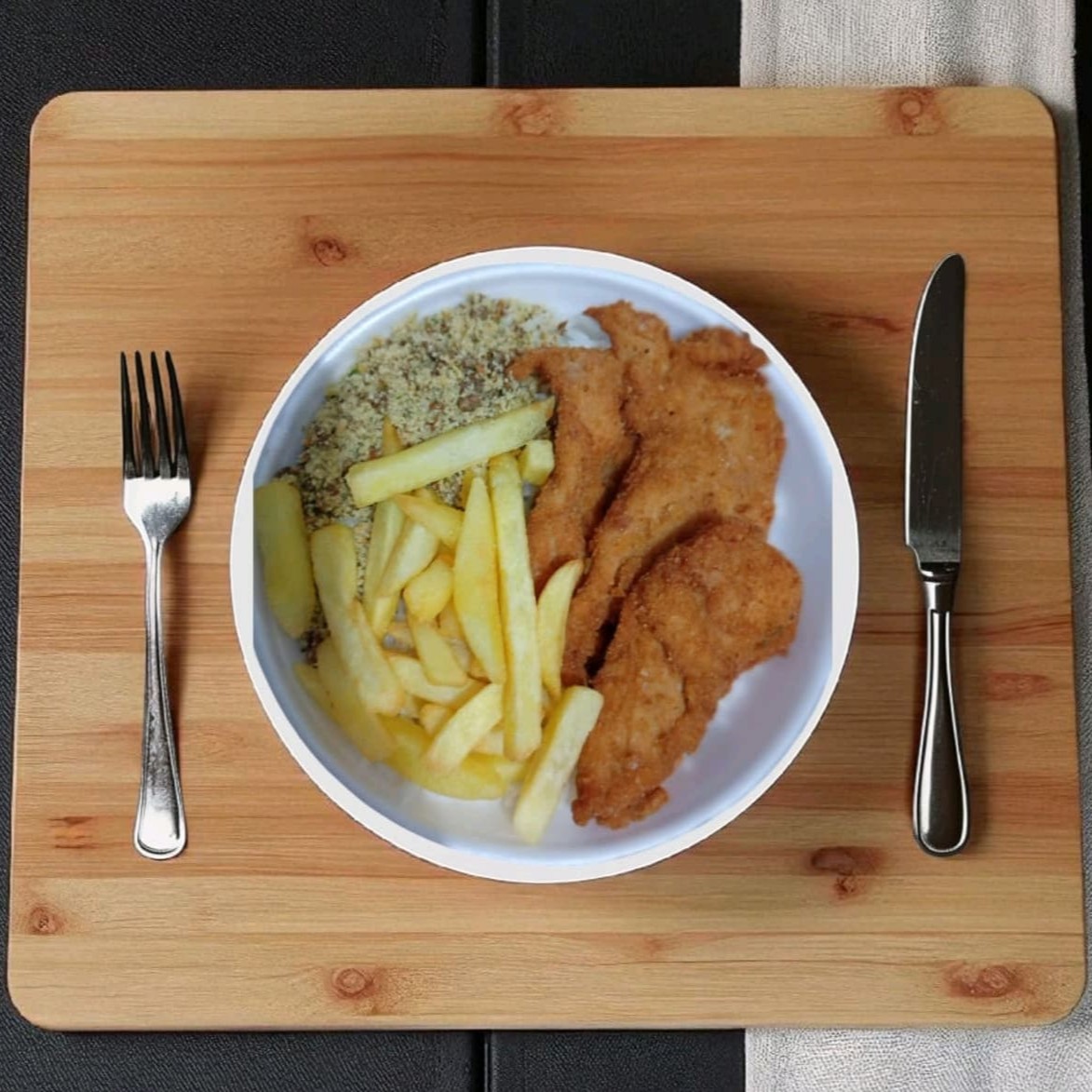Arroz, 2 Filés de Peixe à Milanesa, Batata Frita e Salada Verde