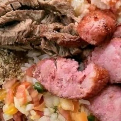 Nossa!! Delícia marmita vai.. Arroz branco soltinho, feijão bem temperado uma deliciosa farofa de costela defumada. ( escolha seu acompanhamento)