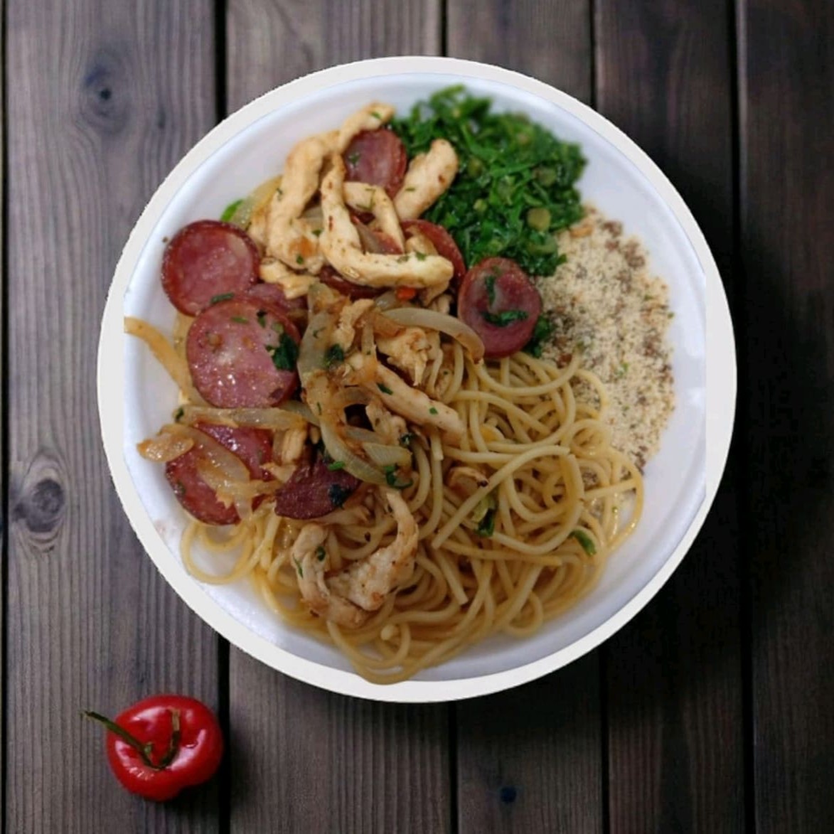 Nossa!! Deliciosa marmita vai .. Arroz branco soltinho, feijão bem temperado,uma deliciosa farofa de costela defumada. (escolha seu acompanhante.)
