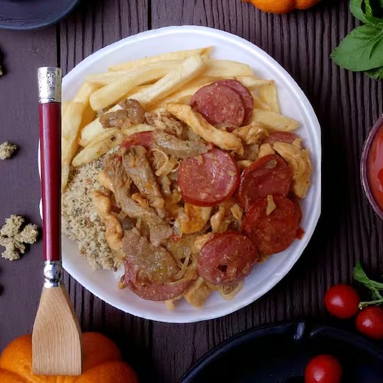 Acompanhamento arroz , fritas, farofa, molho a campanha, alcatra, frango, linguiça.