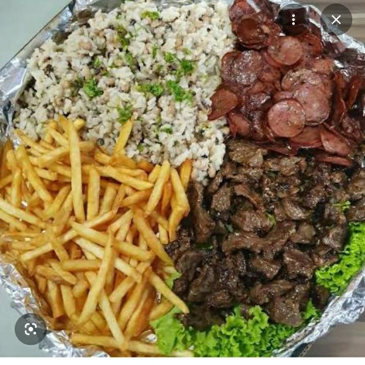 Acompanhamento arroz , fritas , farofa, molho a campanha, alcatra , frango e linguiça