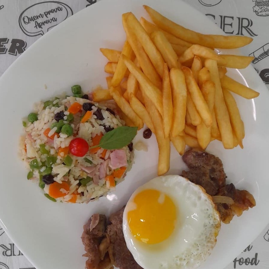 Acompanha: Arroz branco ou integral, fritas ou batata palha, salada de alface e tomate ou legumes.