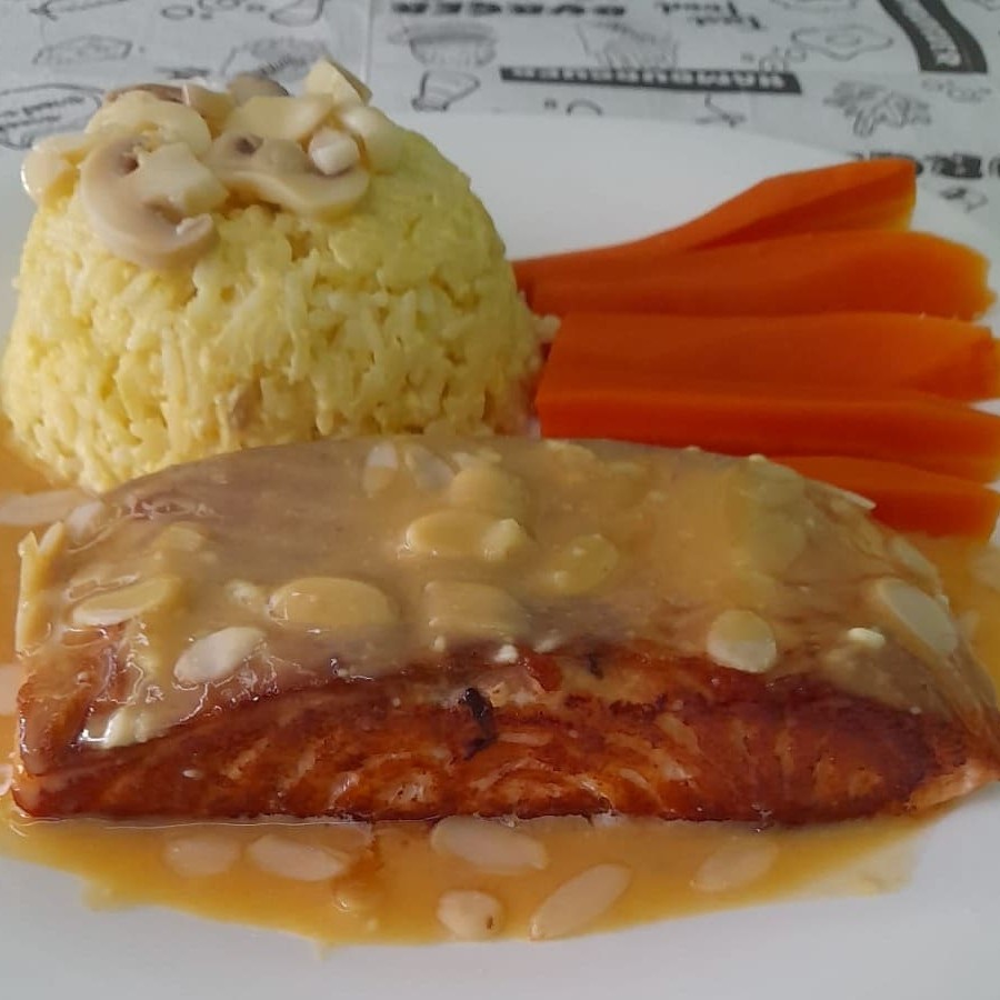 Servido com risoto de palmito e bastoes de cenora salteados no no azeite, molho de laranja com laminas de amendoas.