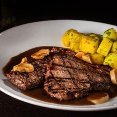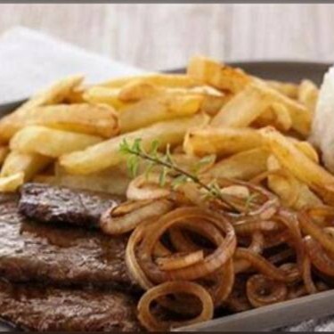 Tiras de picanha aceboladas, acompanha batata frita e molho à campanha