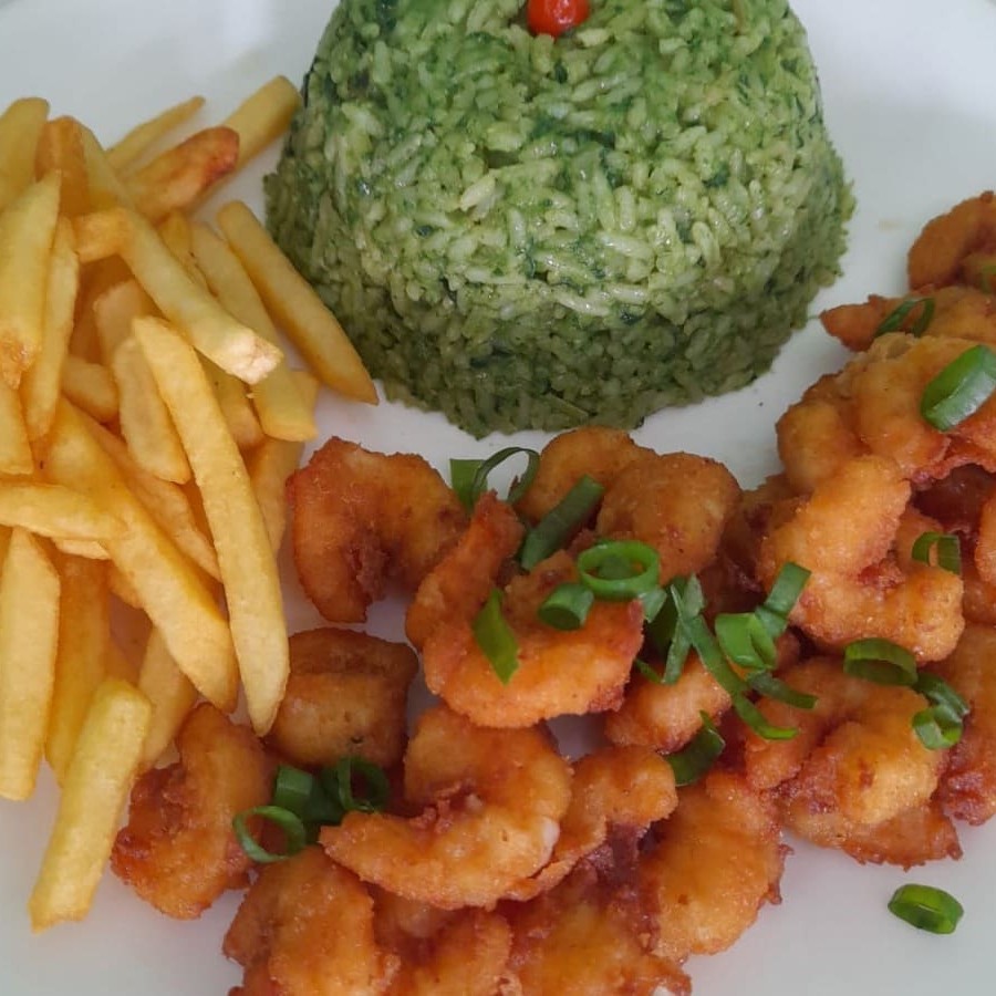 Acompanha: Arroz branco, gurjão de peixe, farofa, fritas feijão e molho.