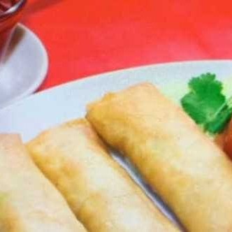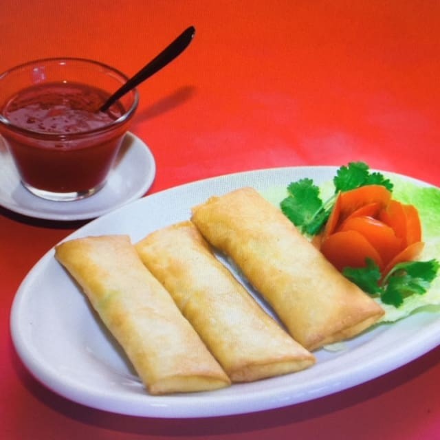Experimente os 4 sabores de rolinho primavera da casa: o tradicional, o vegetariano ,o de queijo e o de carne ao curry.