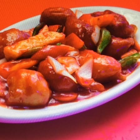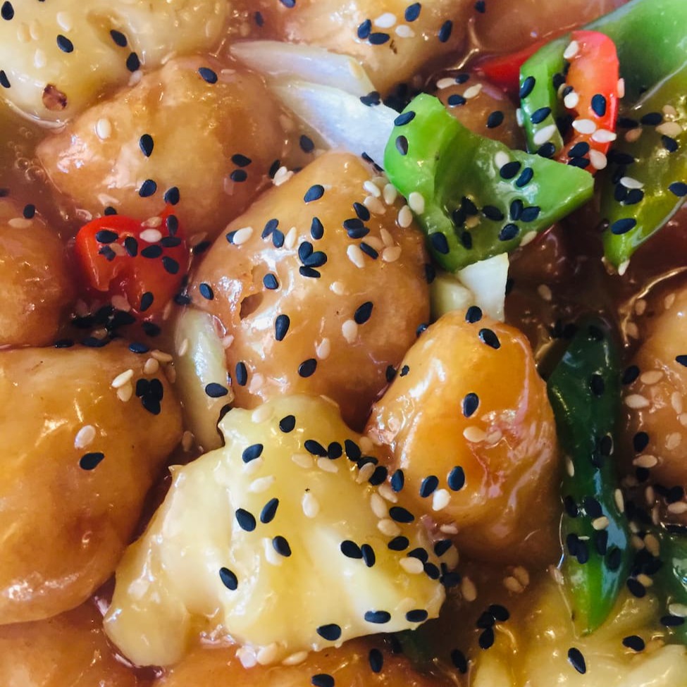Tiras de peixe empanado, cebola, pimentão e abacaxi ao molho agridoce.
