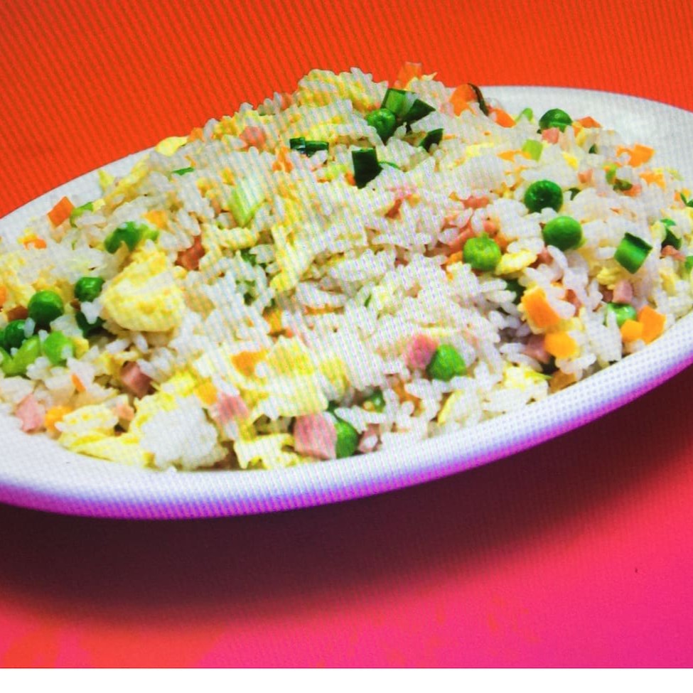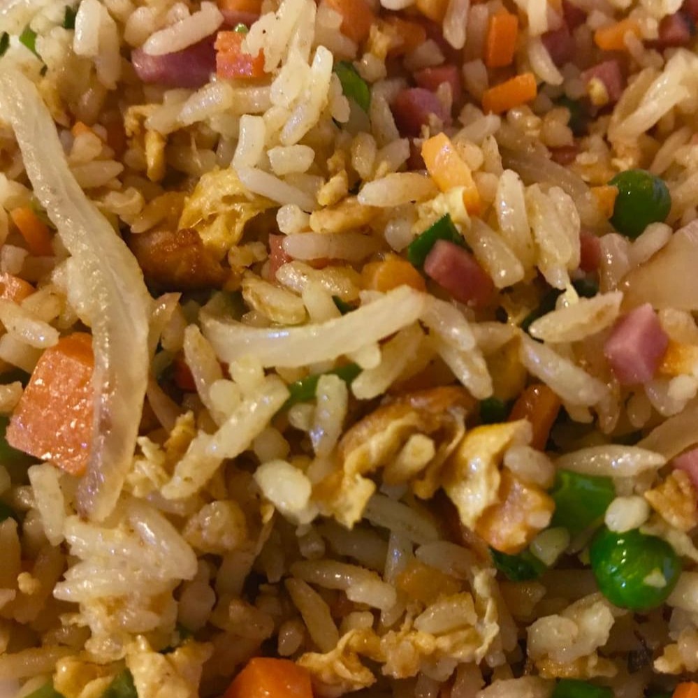 Arroz colorido com presunto, ervilha , ovo mexido e currry. Ligeiramente picante e muito saboroso.
