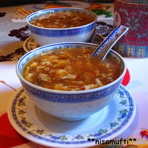 Ideal para quem precisa de uma energia extra , frango desfiado, bambu em tiras, ovo mexido em caldo encorpado de galinha e especiarias. Tambem conhecido como hot&sour soup. Servem 2 . Utilizamos para o transporte da sopa uma embalagem de isopor por entender que mantém melhor a temperatura e impede o vazamento da mesma.