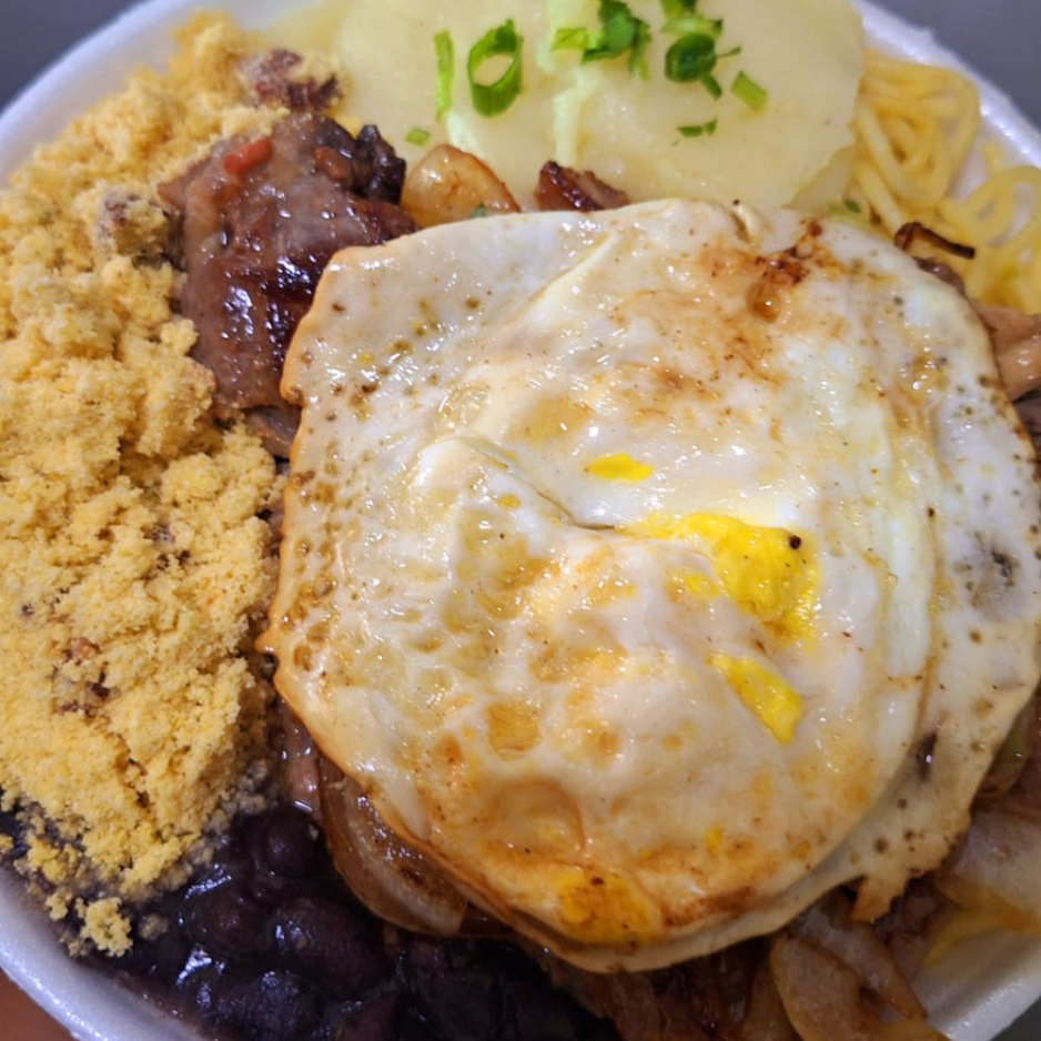 Um delicioso bife a cavalo acompanhado de Arroz, Feijão, Macarrão, Purê, Farofa e Salada "Maionese ou Verde".