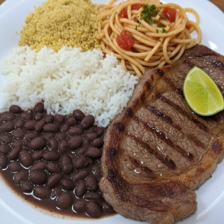 Um delicioso Contra filé Gralhado acompanhado de Arroz, Feijão, Macarrão, Purê, Farofa e Salada "Maionese ou Verde".