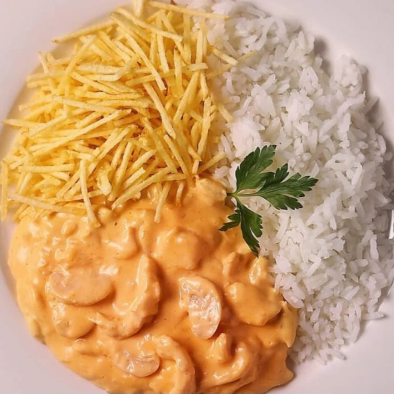 Um delicioso strogonoff de frango acompanhado: de Arroz, e batata palha