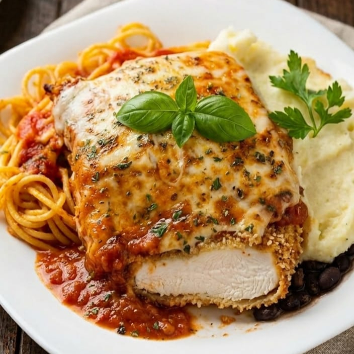 Uma deliciosa parmegiana de frango acompanhado de Arroz, Feijão, Macarrão, Purê, Farofa e Salada "Maionese ou Verde".