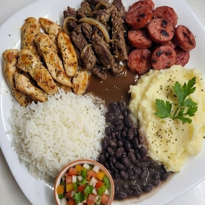 Um delicioso Churrasco misto grelhado com linguiça( calabresa): pedacinhos de peito de frango, e carne de contrafilè uns pedacinhos :acompanhado de Arroz, Feijão, Macarrão, Purê, Farofa e Salada "Maionese ou Verde".
