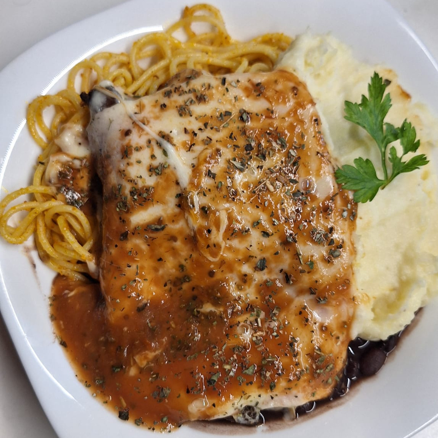Uma deliciosa parmegiana de carne acompanhado de Arroz, Feijão, Macarrão, Purê, Farofa e Salada "Maionese ou Verde".